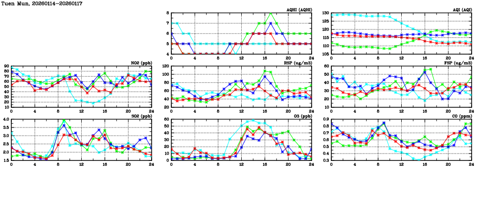 | Air Quality Data Time Series in Tuen Mun (2026/01/17) | ( Line colors: Day -3 Day -2 Day -1 Current day ) | 2D Map Current AQHI |
