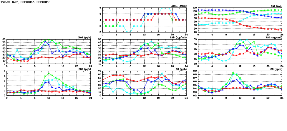 | Air Quality Data Time Series in Tsuen Wan (2026/01/18) | ( Line colors: Day -3 Day -2 Day -1 Current day ) | 2D Map Current AQHI |