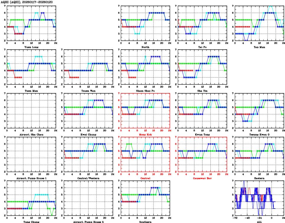 | Air Quality Data Time Series for AQHI (2026/01/20) | ( Line colors: Day -3 Day -2 Day -1 Current day ) | 2D Map Current AQHI |