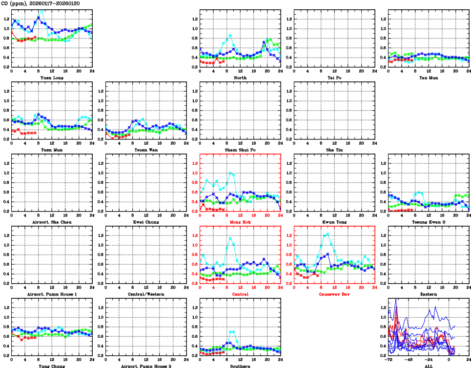 | Air Quality Data Time Series for CO (2026/01/20) | ( Line colors: Day -3 Day -2 Day -1 Current day ) | 2D Map Current AQHI |