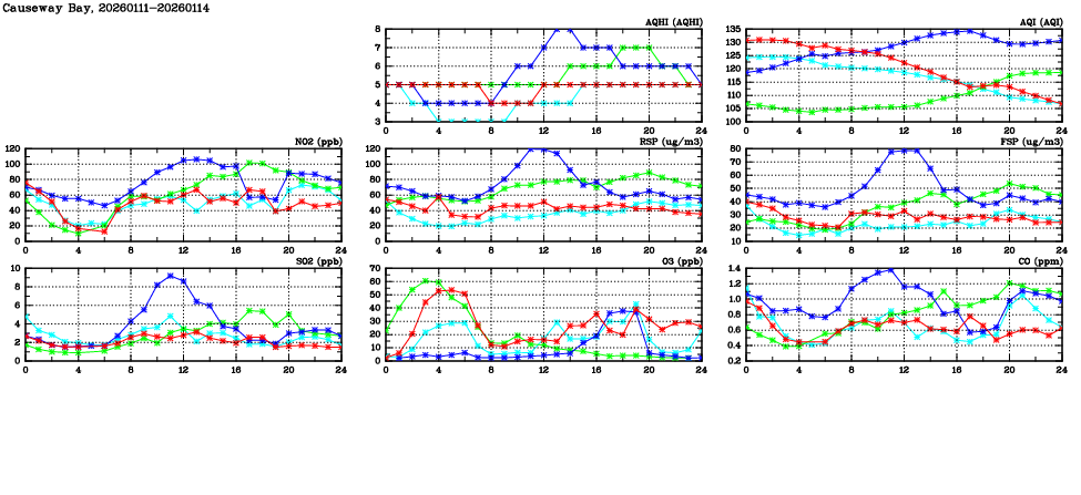 | Air Quality Data Time Series in Causeway Bay (2026/01/14) | ( Line colors: Day -3 Day -2 Day -1 Current day ) | 2D Map Current AQHI |