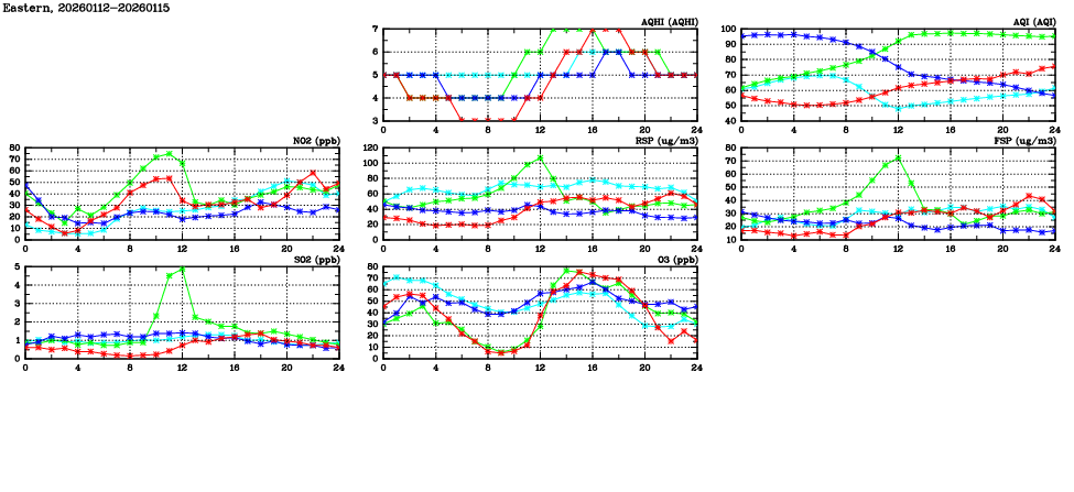 | Air Quality Data Time Series in Eastern (2026/01/15) | ( Line colors: Day -3 Day -2 Day -1 Current day ) | 2D Map Current AQHI |