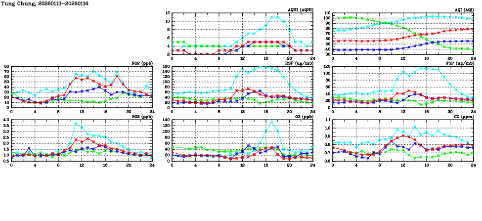 | Air Quality Data Time Series in Tung Chung (2026/01/16) | ( Line colors: Day -3 Day -2 Day -1 Current day ) | 2D Map Current AQHI |