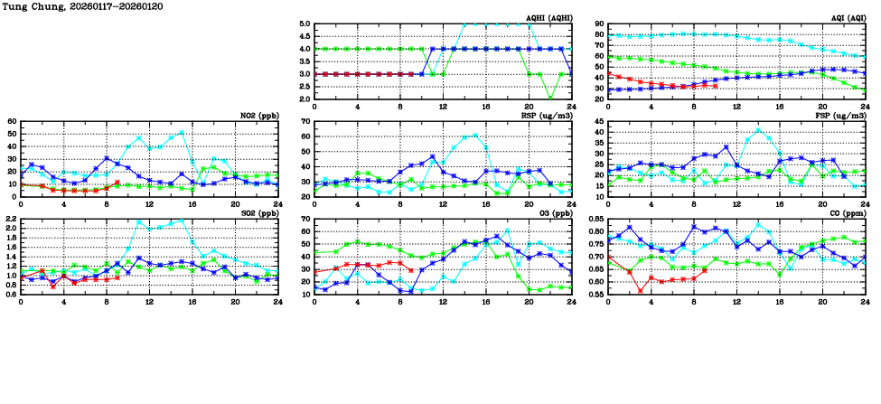 | Air Quality Data Time Series in Tung Chung (2026/01/20) | ( Line colors: Day -3 Day -2 Day -1 Current day ) | 2D Map Current AQHI |