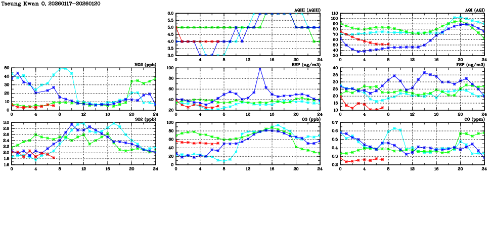 | Air Quality Data Time Series in Tseung Kwan O (2026/01/20) | ( Line colors: Day -3 Day -2 Day -1 Current day ) | 2D Map Current AQHI |