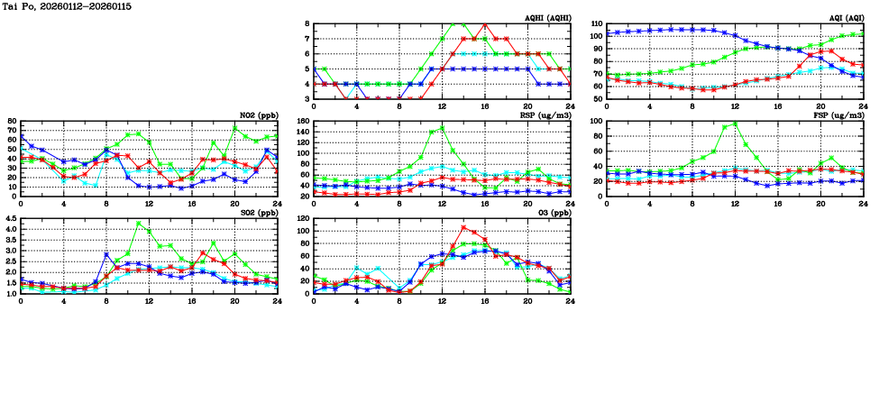 | Air Quality Data Time Series in Tai Po (2026/01/15) | ( Line colors: Day -3 Day -2 Day -1 Current day ) | 2D Map Current AQHI |