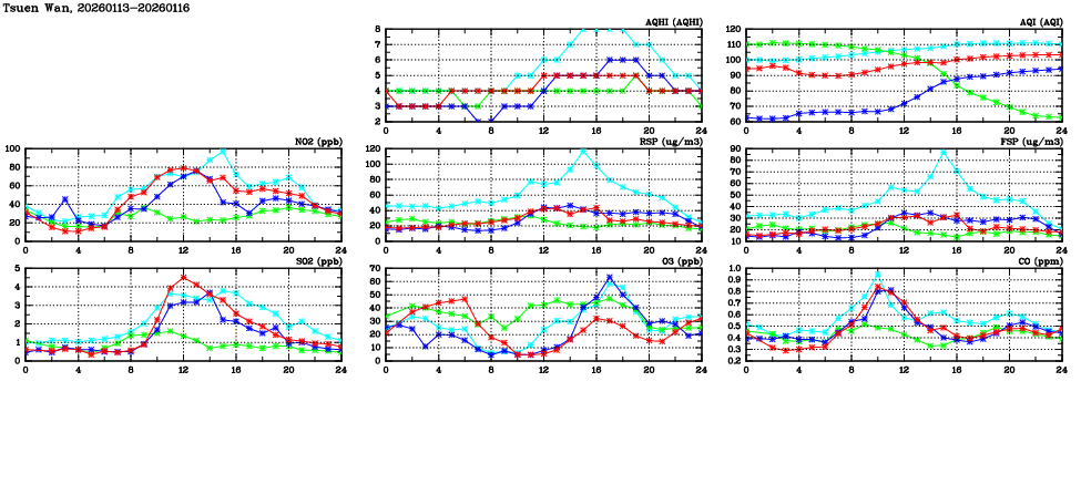 | Air Quality Data Time Series in Tsuen Wan (2026/01/16) | ( Line colors: Day -3 Day -2 Day -1 Current day ) | 2D Map Current AQHI |