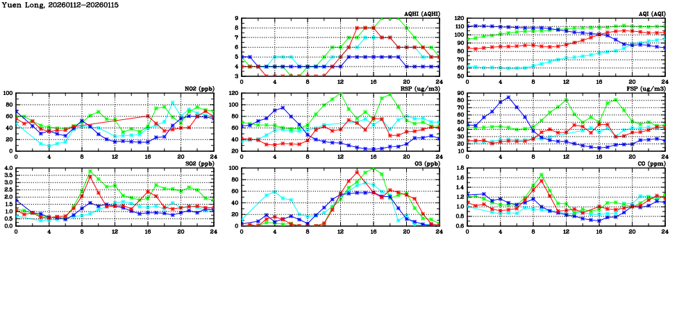 | Air Quality Data Time Series in Yuen Long (2026/01/15) | ( Line colors: Day -3 Day -2 Day -1 Current day ) | 2D Map Current AQHI |
