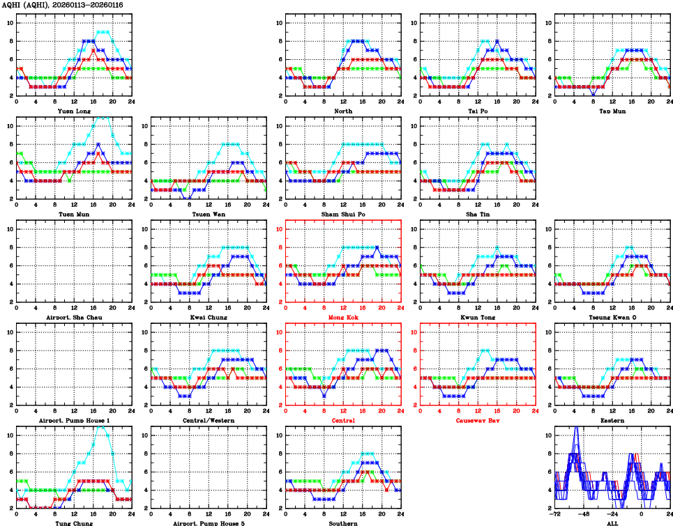 | Air Quality Data Time Series for AQHI (2026/01/16) | ( Line colors: Day -3 Day -2 Day -1 Current day ) | 2D Map Current AQHI |