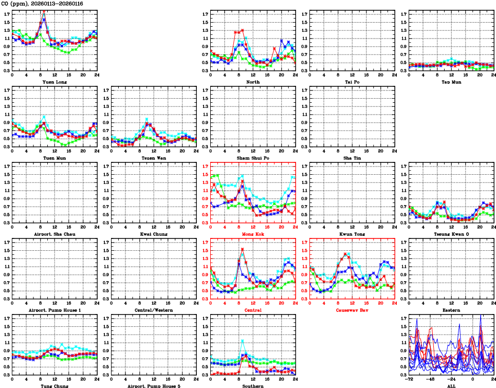 | Air Quality Data Time Series for CO (2026/01/16) | ( Line colors: Day -3 Day -2 Day -1 Current day ) | 2D Map Current AQHI |