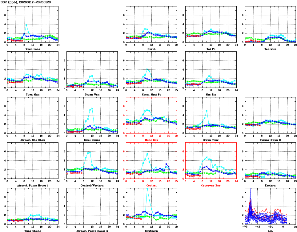 | Air Quality Data Time Series for SO2 (2026/01/20) | ( Line colors: Day -3 Day -2 Day -1 Current day ) | 2D Map Current AQHI |