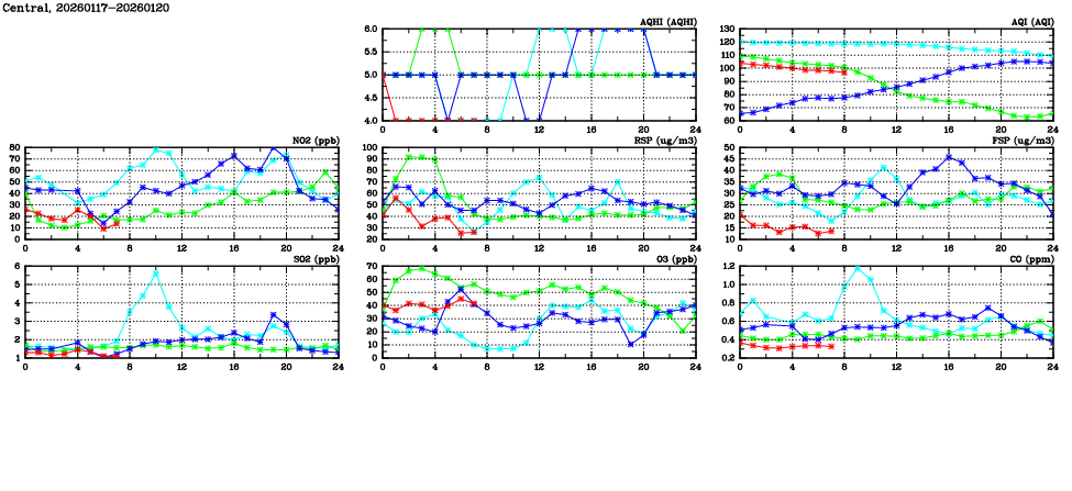 | Air Quality Data Time Series in Central (2026/01/20) | ( Line colors: Day -3 Day -2 Day -1 Current day ) | 2D Map Current AQHI |