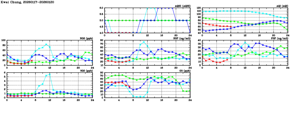 | Air Quality Data Time Series in Kwai Chung (2026/01/20) | ( Line colors: Day -3 Day -2 Day -1 Current day ) | 2D Map Current AQHI |