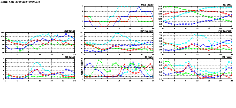 | Air Quality Data Time Series in Mong Kok (2026/01/16) | ( Line colors: Day -3 Day -2 Day -1 Current day ) | 2D Map Current AQHI |