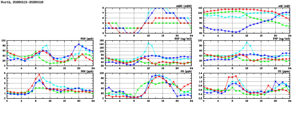 | Air Quality Data Time Series in North (2026/01/16) | ( Line colors: Day -3 Day -2 Day -1 Current day ) | 2D Map Current AQHI |