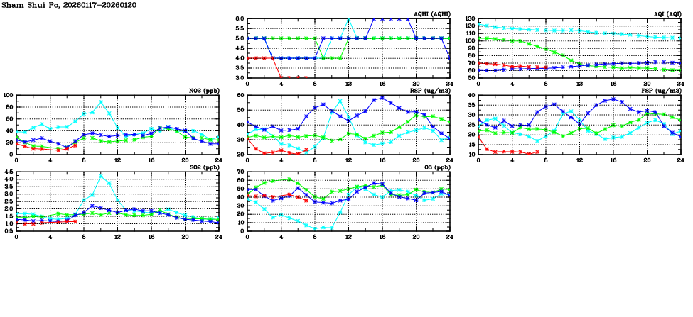 | Air Quality Data Time Series in Sham Shui Po (2026/01/20) | ( Line colors: Day -3 Day -2 Day -1 Current day ) | 2D Map Current AQHI |