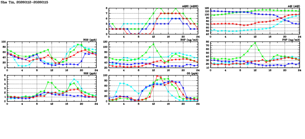 | Air Quality Data Time Series in Sha Tin (2026/01/15) | ( Line colors: Day -3 Day -2 Day -1 Current day ) | 2D Map Current AQHI |