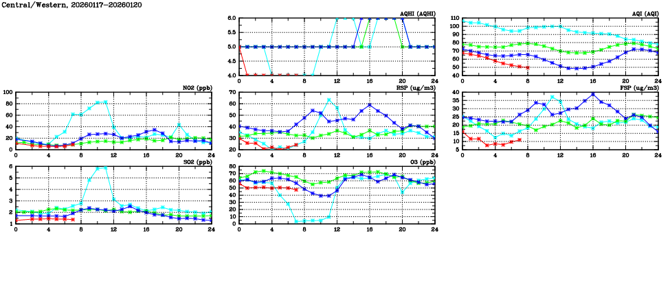 | Air Quality Data Time Series in Central/Western (2026/01/20) | ( Line colors: Day -3 Day -2 Day -1 Current day ) | 2D Map Current AQHI |