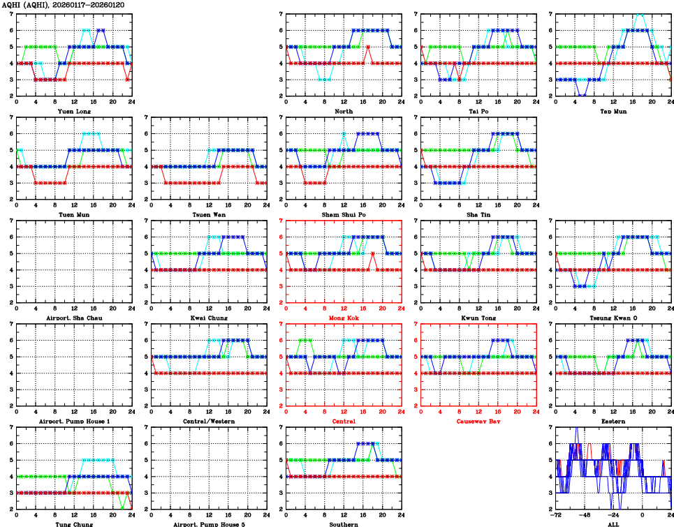 | Air Quality Data Time Series for AQHI (2026/01/20) | ( Line colors: Day -3 Day -2 Day -1 Current day ) | 2D Map Current AQHI |