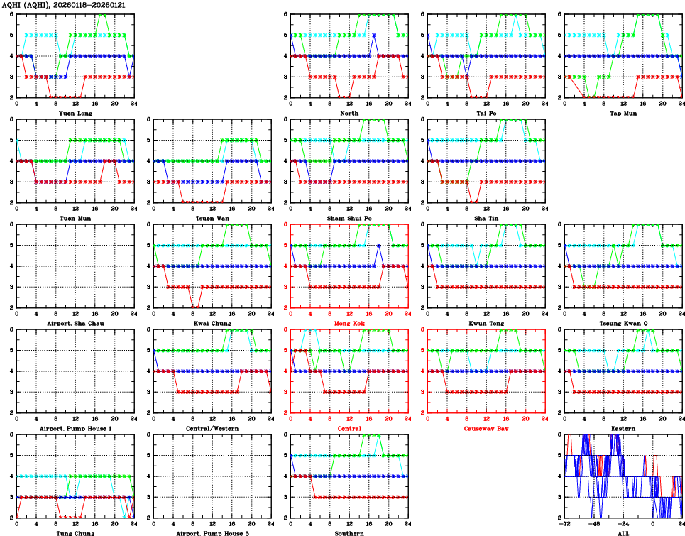 | Air Quality Data Time Series for AQHI (2026/01/21) | ( Line colors: Day -3 Day -2 Day -1 Current day ) | 2D Map Current AQHI |