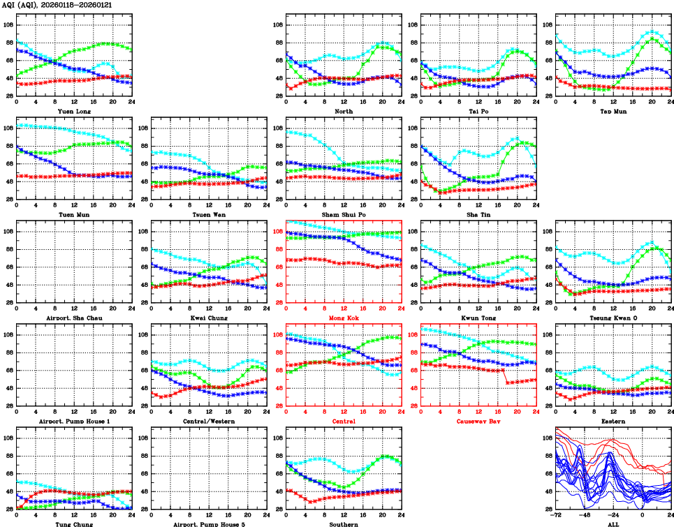 | Air Quality Data Time Series for AQI (2026/01/21) | ( Line colors: Day -3 Day -2 Day -1 Current day ) | 2D Map Current AQHI |