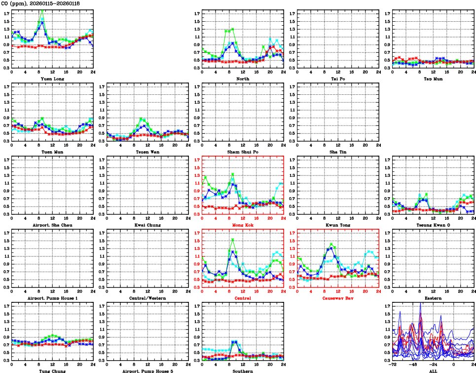 | Air Quality Data Time Series for CO (2026/01/18) | ( Line colors: Day -3 Day -2 Day -1 Current day ) | 2D Map Current AQHI |