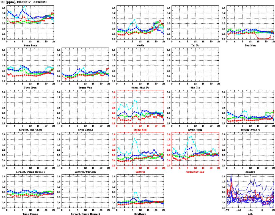 | Air Quality Data Time Series for CO (2026/01/20) | ( Line colors: Day -3 Day -2 Day -1 Current day ) | 2D Map Current AQHI |