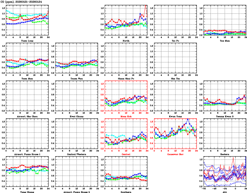| Air Quality Data Time Series for CO (2026/01/24) | ( Line colors: Day -3 Day -2 Day -1 Current day ) | 2D Map Current AQHI |