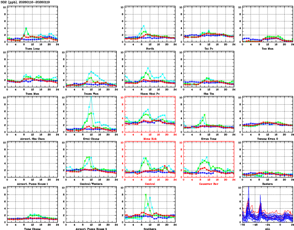 | Air Quality Data Time Series for SO2 (2026/01/19) | ( Line colors: Day -3 Day -2 Day -1 Current day ) | 2D Map Current AQHI |