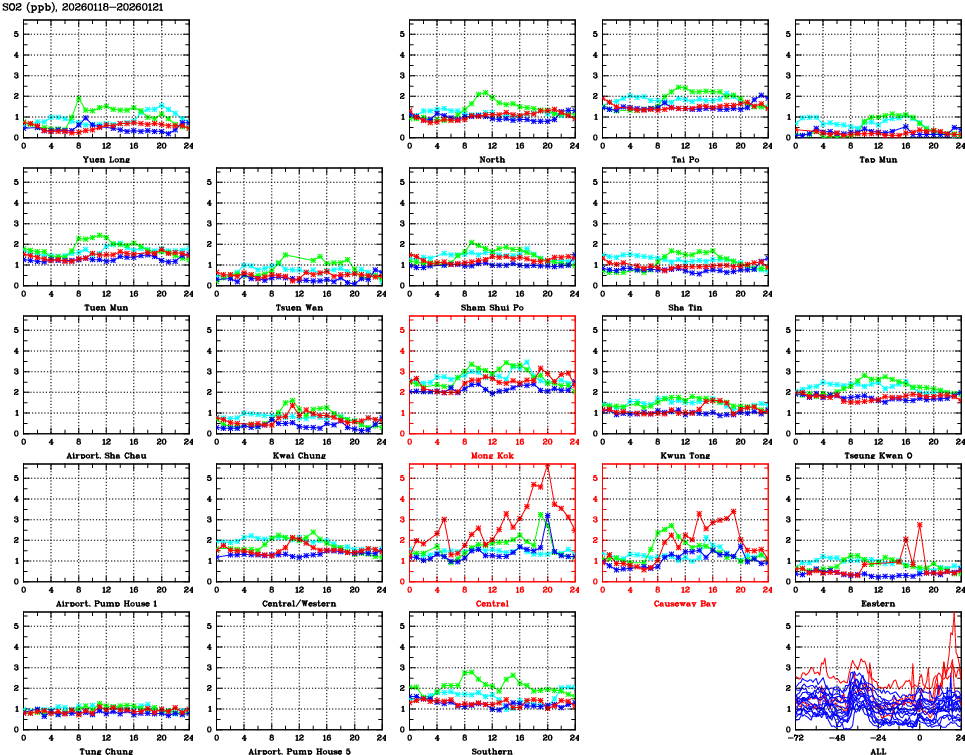 | Air Quality Data Time Series for SO2 (2026/01/21) | ( Line colors: Day -3 Day -2 Day -1 Current day ) | 2D Map Current AQHI |