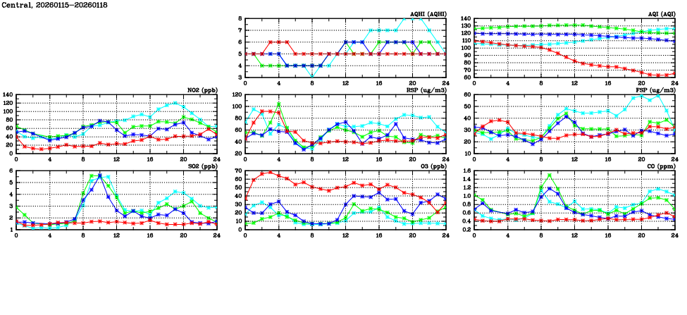 | Air Quality Data Time Series in Central (2026/01/18) | ( Line colors: Day -3 Day -2 Day -1 Current day ) | 2D Map Current AQHI |