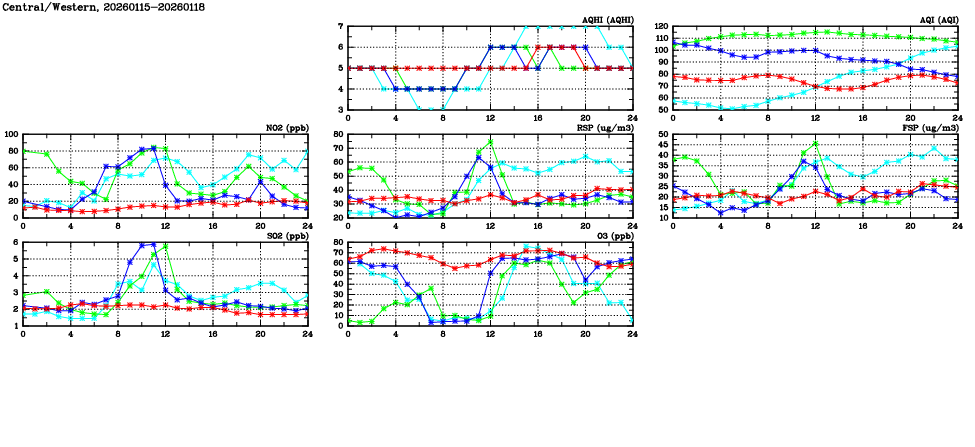 | Air Quality Data Time Series in Central/Western (2026/01/18) | ( Line colors: Day -3 Day -2 Day -1 Current day ) | 2D Map Current AQHI |