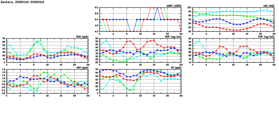 | Air Quality Data Time Series in Eastern (2026/01/19) | ( Line colors: Day -3 Day -2 Day -1 Current day ) | 2D Map Current AQHI |