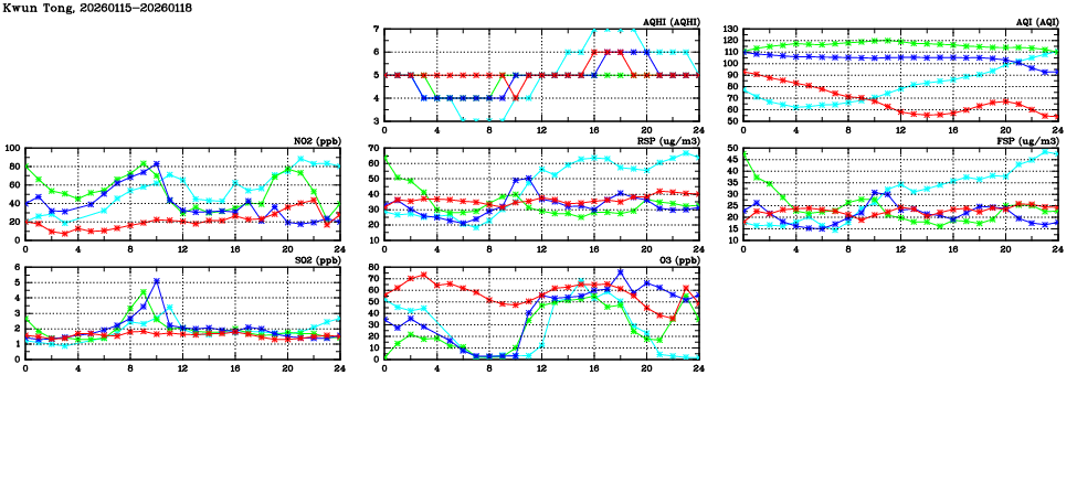 | Air Quality Data Time Series in Kwun Tong (2026/01/18) | ( Line colors: Day -3 Day -2 Day -1 Current day ) | 2D Map Current AQHI |