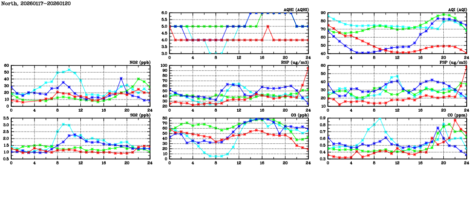 | Air Quality Data Time Series in North (2026/01/20) | ( Line colors: Day -3 Day -2 Day -1 Current day ) | 2D Map Current AQHI |