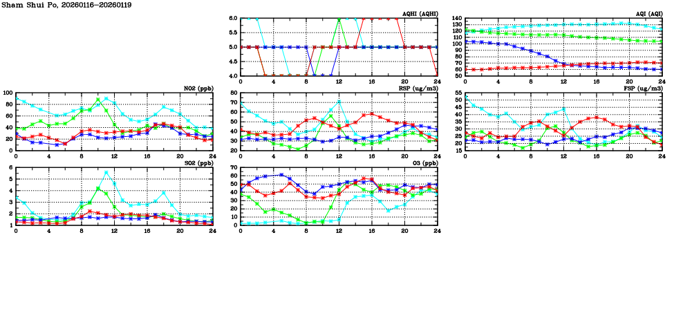 | Air Quality Data Time Series in Sham Shui Po (2026/01/19) | ( Line colors: Day -3 Day -2 Day -1 Current day ) | 2D Map Current AQHI |