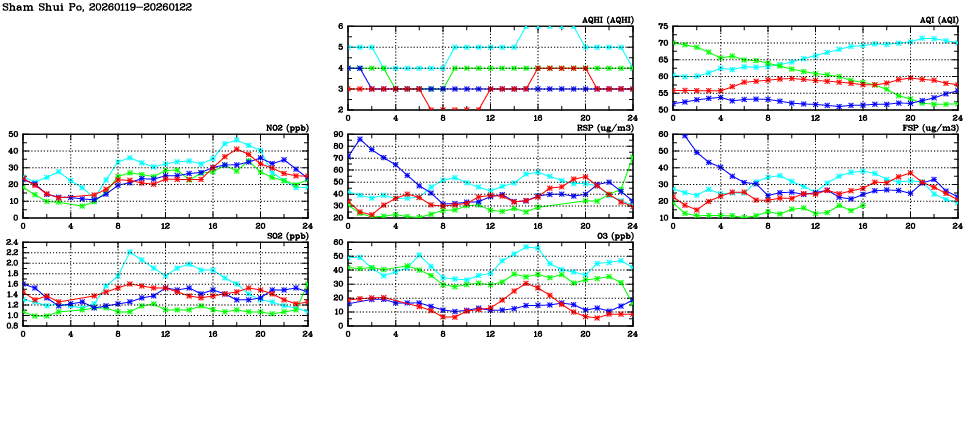 | Air Quality Data Time Series in Sham Shui Po (2026/01/22) | ( Line colors: Day -3 Day -2 Day -1 Current day ) | 2D Map Current AQHI |