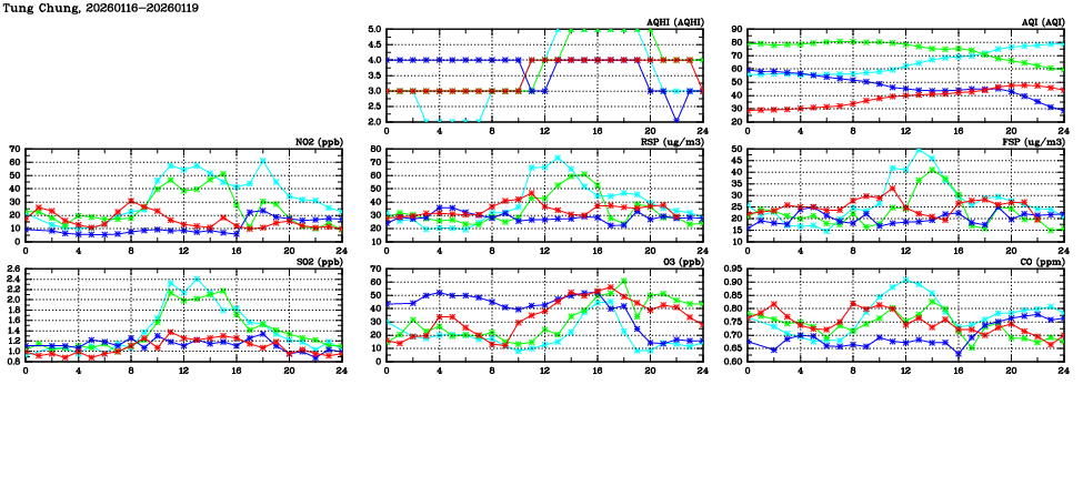 | Air Quality Data Time Series in Tung Chung (2026/01/19) | ( Line colors: Day -3 Day -2 Day -1 Current day ) | 2D Map Current AQHI |