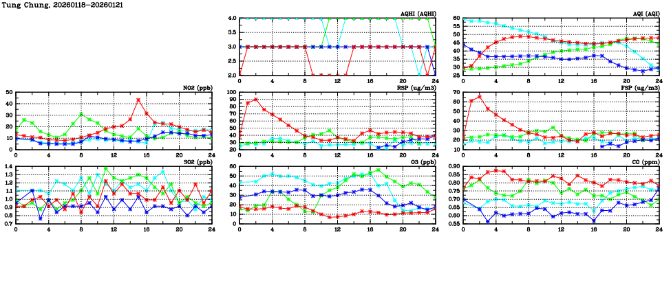 | Air Quality Data Time Series in Tung Chung (2026/01/21) | ( Line colors: Day -3 Day -2 Day -1 Current day ) | 2D Map Current AQHI |