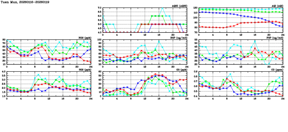 | Air Quality Data Time Series in Tuen Mun (2026/01/19) | ( Line colors: Day -3 Day -2 Day -1 Current day ) | 2D Map Current AQHI |