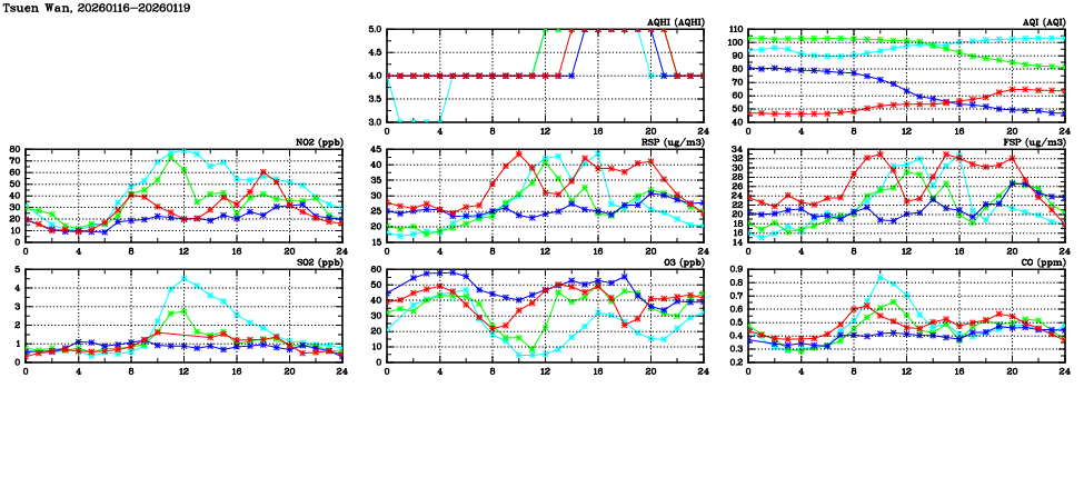 | Air Quality Data Time Series in Tsuen Wan (2026/01/19) | ( Line colors: Day -3 Day -2 Day -1 Current day ) | 2D Map Current AQHI |