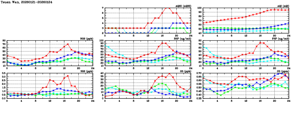 | Air Quality Data Time Series in Tsuen Wan (2026/01/24) | ( Line colors: Day -3 Day -2 Day -1 Current day ) | 2D Map Current AQHI |