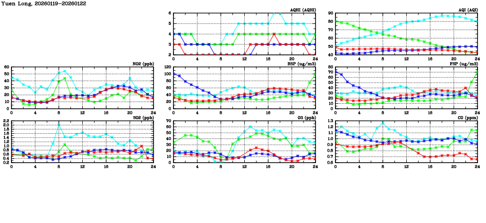 | Air Quality Data Time Series in Yuen Long (2026/01/22) | ( Line colors: Day -3 Day -2 Day -1 Current day ) | 2D Map Current AQHI |