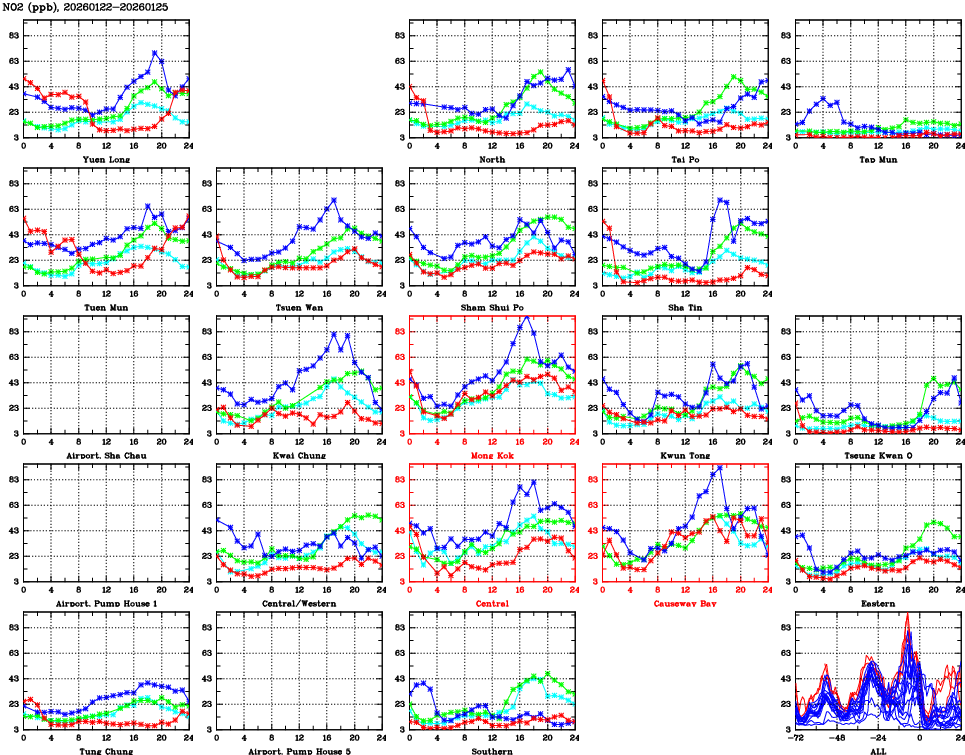 | Air Quality Data Time Series for NO2 (2026/01/25) | ( Line colors: Day -3 Day -2 Day -1 Current day ) | 2D Map Current AQHI |