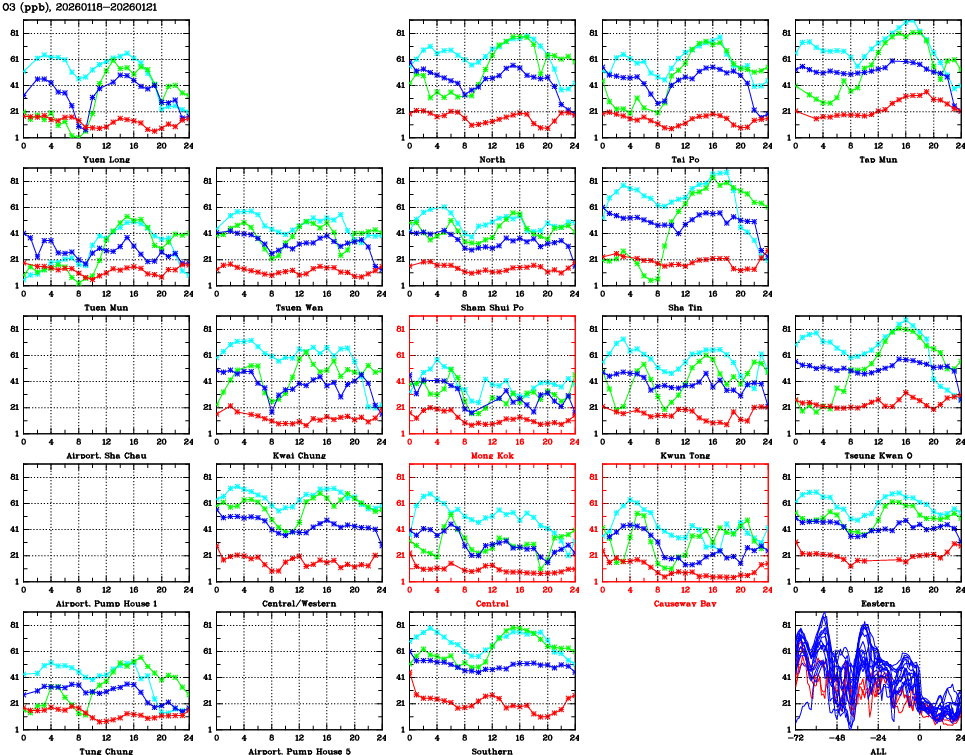 | Air Quality Data Time Series for O3 (2026/01/21) | ( Line colors: Day -3 Day -2 Day -1 Current day ) | 2D Map Current AQHI |