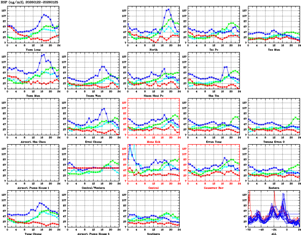 | Air Quality Data Time Series for RSP (2026/01/25) | ( Line colors: Day -3 Day -2 Day -1 Current day ) | 2D Map Current AQHI |