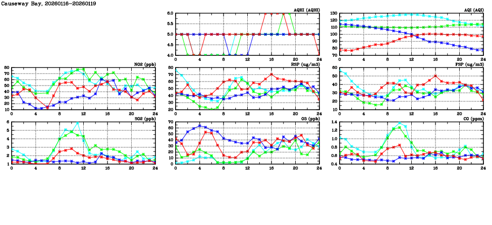 | Air Quality Data Time Series in Causeway Bay (2026/01/19) | ( Line colors: Day -3 Day -2 Day -1 Current day ) | 2D Map Current AQHI |