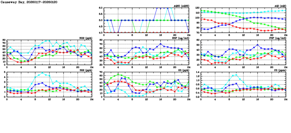 | Air Quality Data Time Series in Causeway Bay (2026/01/20) | ( Line colors: Day -3 Day -2 Day -1 Current day ) | 2D Map Current AQHI |