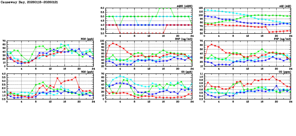 | Air Quality Data Time Series in Causeway Bay (2026/01/21) | ( Line colors: Day -3 Day -2 Day -1 Current day ) | 2D Map Current AQHI |