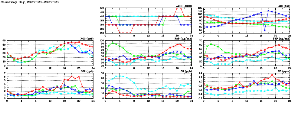 | Air Quality Data Time Series in Causeway Bay (2026/01/23) | ( Line colors: Day -3 Day -2 Day -1 Current day ) | 2D Map Current AQHI |